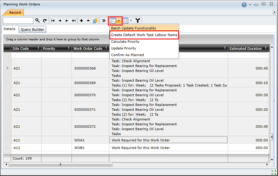 This batch update functionality enables you to add default work task labour items to work order tasks that do not have any labour items.