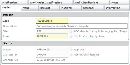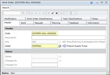 - If the Work Order’s Type of Work has an initial Work Order Status then this Status applies to the Work Order.