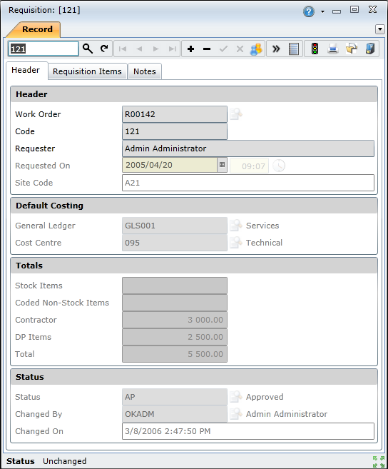 The Requisitions edit window contains three tabs: Header, Requisition Items, and Notes.