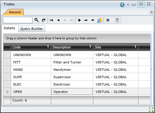 The Trades browse window lists all the trades for the sites you have access to. To open the Trades browse window, expand the Main Menu, expand the Staff module, select Trades, and then click the Show Browse Window (