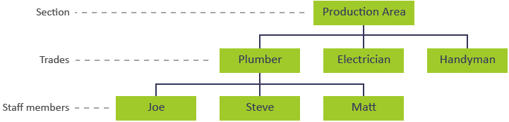 A trade represents a specific skillset that exists in a section. Staff members are assigned to trades based on the skills they possess, as well as their competency levels. For example, a 'Plumber' trade can be created to group all staff members that do plumbing work in a specific section. The diagram below illustrates this example.