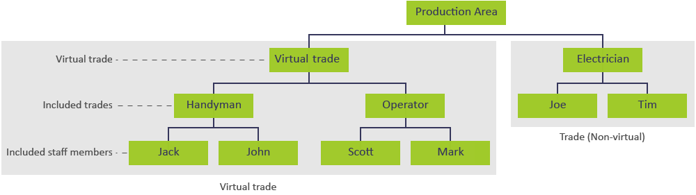 On Key also enables you to create virtual trades. Virtual trades are trades that consist of other trades, instead of individual staff members. They are used to create a logical grouping of trades that are capable of performing a specific type of work. This means that work assigned to a virtual trade can be performed by any staff member from any of the included trades. For example, the diagram below shows a virtual trade that includes the 'Handyman' and 'Operator' trades. Any work assigned to this virtual trade can be performed by Jack, John, Scott, or Mark.